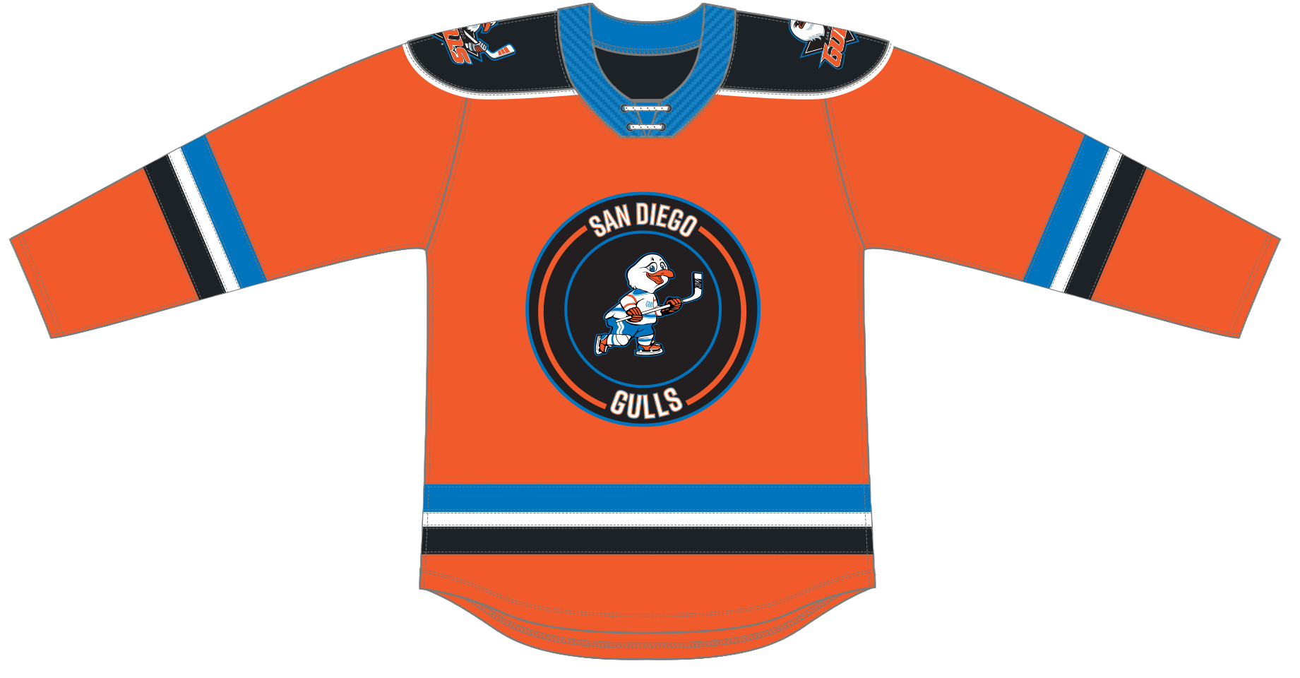 The CCM Quicklite San Diego Gulls Premier Orange Alternate Jersey is made of high-quality polyester two-way stretch pique fabric and has solid mesh inserts for ventilation. This officially licensed jersey is engineered to duplicate the on-ice team jersey. The front crest is embroidered just like the authentic jersey and the single layer screen printed tackle twill shoulder patches (where applicable) are applied directly to the jersey.