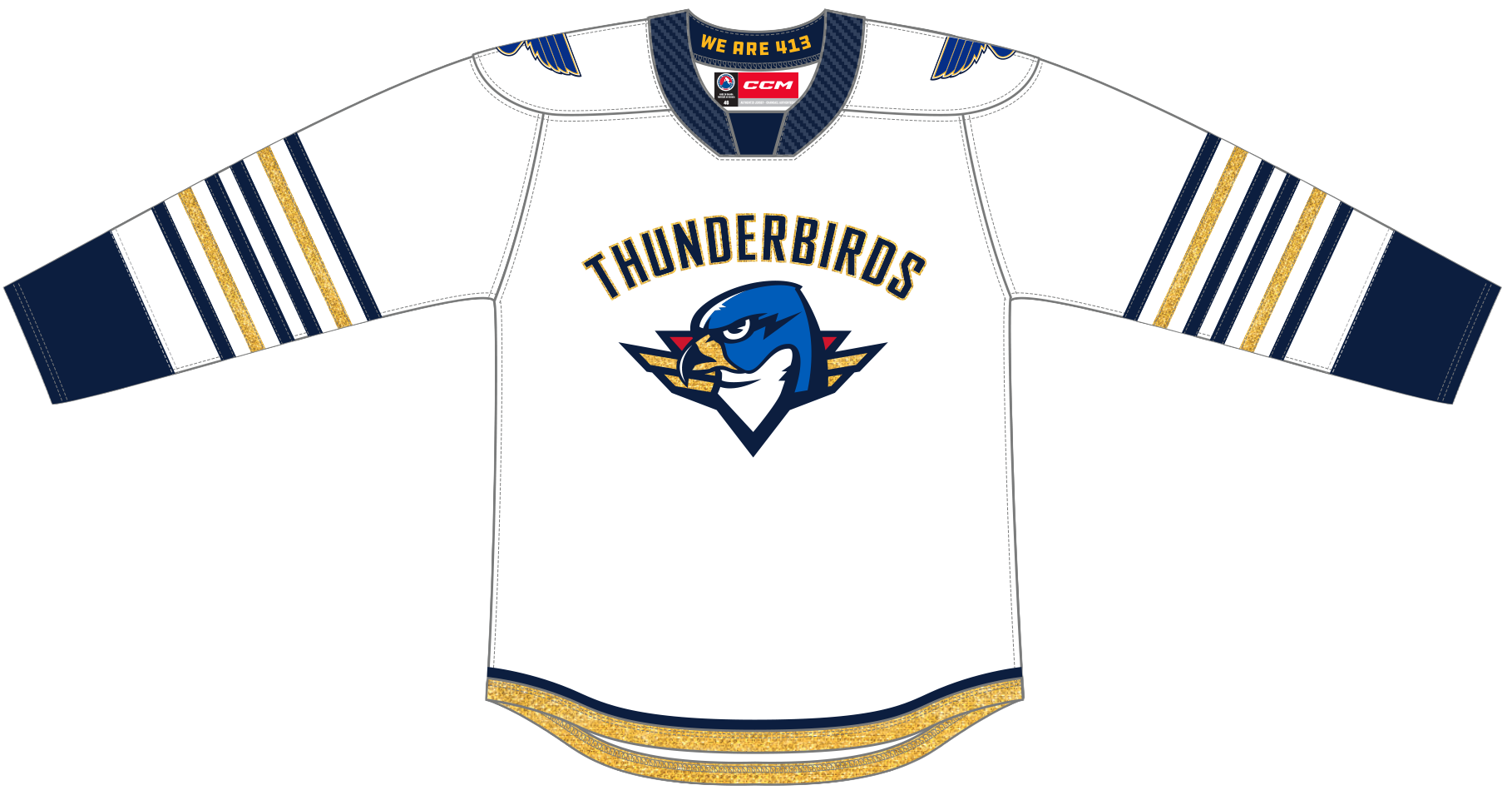 The CCM Quicklite Springfield Thunderbirds Premier White Jersey is made of high-quality polyester two-way stretch pique fabric and has solid mesh inserts for ventilation. This officially licensed jersey is engineered to duplicate the on-ice team jersey. The front crest is embroidered just like the authentic jersey and the single layer screen printed tackle twill shoulder patches (where applicable) are applied to the jersey.