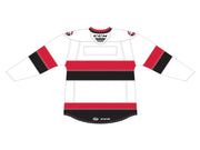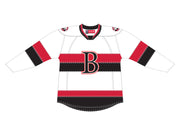 The CCM Quicklite Belleville Senators White Premier team color jersey is made of high-quality polyester two-way stretch pique fabric and has solid mesh inserts for ventilation. This officially licensed jersey is engineered to duplicate the on-ice team jersey. The front crest is embroidered just like the authentic jersey and the single layer screen printed tackle twill shoulder patches (where applicable) are applied directly to the jersey.