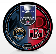 Collect all 2024 Calder Cup Playoffs dueling souvenir pucks including this puck from the Cleveland Monsters vs Belleville Senators 2024 North Division Semifinals.