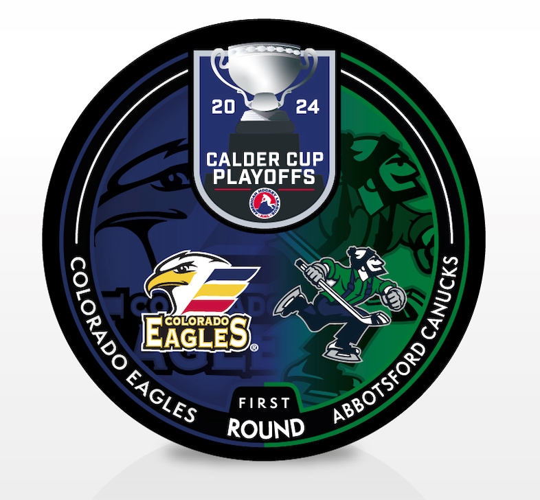 Collect all 2024 Calder Cup Playoffs dueling souvenir pucks including this puck from the Colorado Eagles vs Abbotsford Canucks 2024 Pacific Division First Round.