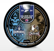 Collect all 2024 Calder Cup Playoffs dueling souvenir pucks including this puck from the Milwaukee Admirals vs Grand Rapids Griffins 2024 Central Division Finals.