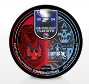 Collect all 2024 Calder Cup Playoffs dueling souvenir pucks including this puck from the Coachella Valley Firebirds vs Milwaukee Admirals 2024 Western Conference Finals.