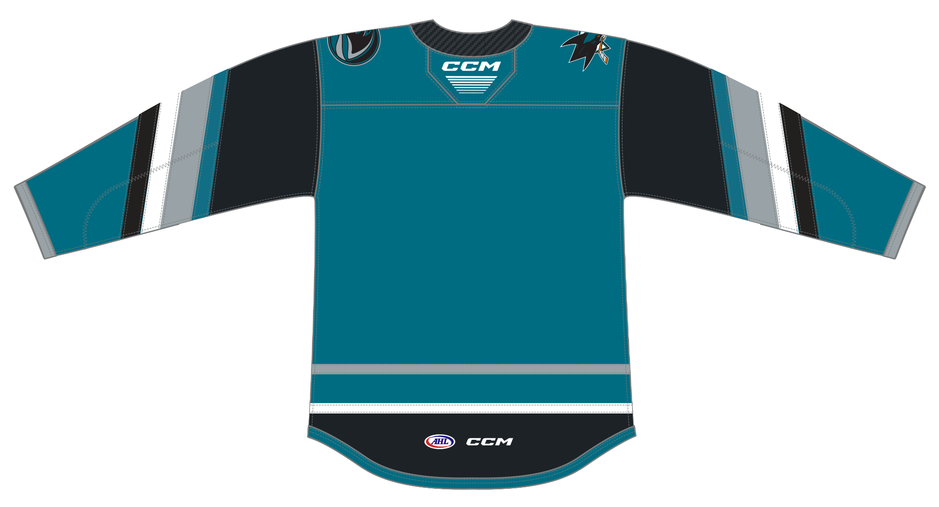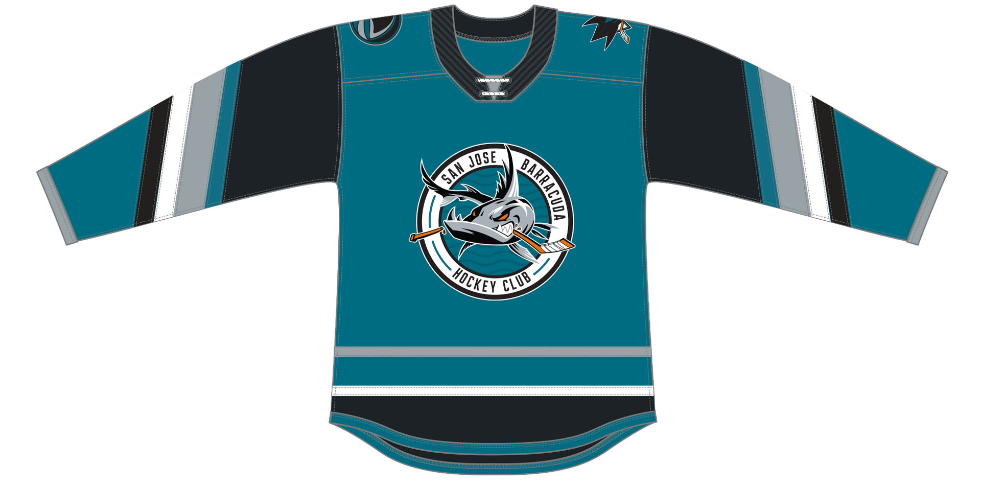 The CCM Quicklite San Jose Barracuda Premier Teal Jersey is made of high-quality polyester two-way stretch pique fabric and has solid mesh inserts for ventilation. This officially licensed jersey is engineered to duplicate the on-ice team jersey. The front crest is embroidered just like the authentic jersey and the single layer screen printed tackle twill shoulder patches (where applicable) are applied directly to the jersey.