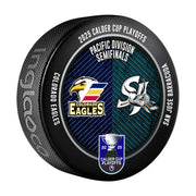 Collect all 2025 Calder Cup Playoffs dueling souvenir pucks including this puck from the Colorado Eagles vs San Jose Barracuda 2025 Pacific Division Semifinals.