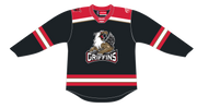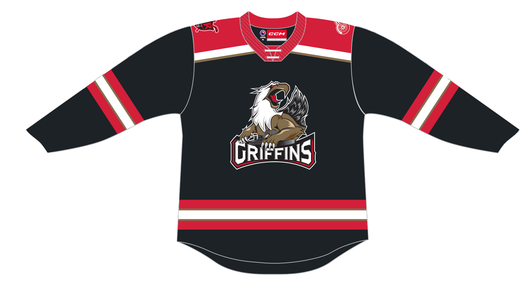 The CCM Quicklite Grand Rapids Griffins Black Premier team color jersey is made of high-quality polyester two-way stretch pique fabric and has solid mesh inserts for ventilation. This officially licensed jersey is engineered to duplicate the on-ice team jersey. The front crest is embroidered just like the authentic jersey and the single layer screen printed tackle twill shoulder patches (where applicable) are applied directly to the jersey.